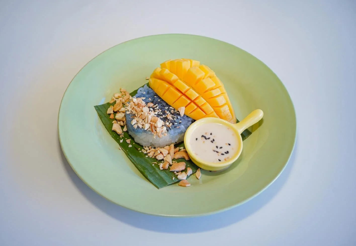 Classic Thai mango sticky rice, coconut sauce, Phuket cashew nut