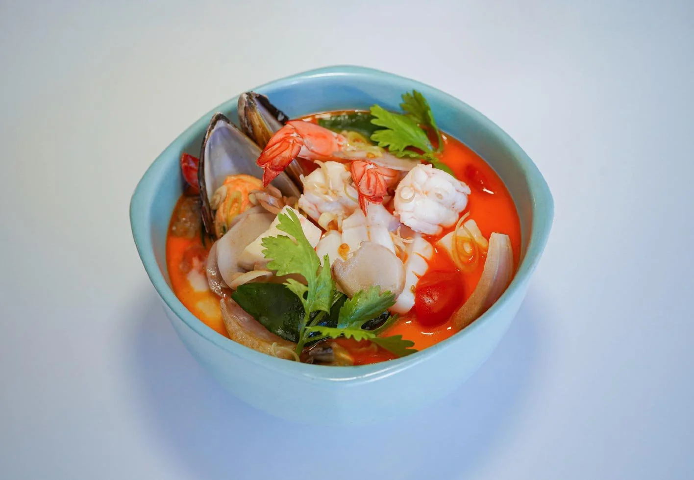 Spicy and sour seafood soup with lemongrass, galangal and kaffir lime leaf, served with steamed rice