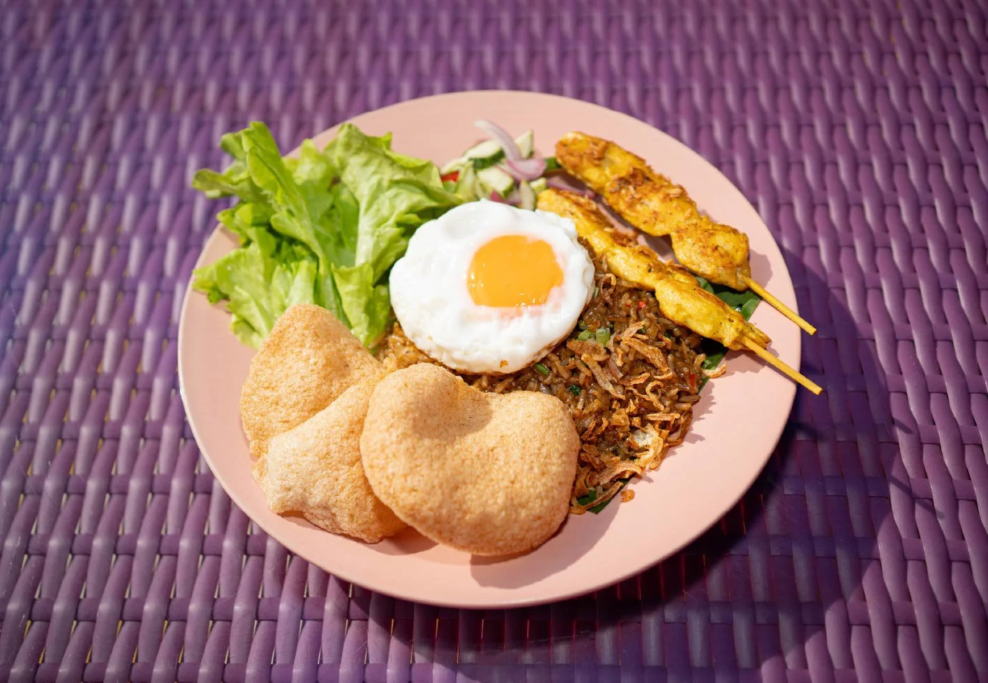 Traditional Indonesian fried rice with shrimp paste, chicken skewers, shrimp cracker and homemade pickles.