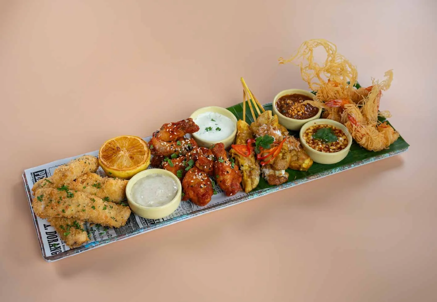 Buffalo wing, fish tenders, chicken satay, crispy noodle wrapped shrimp