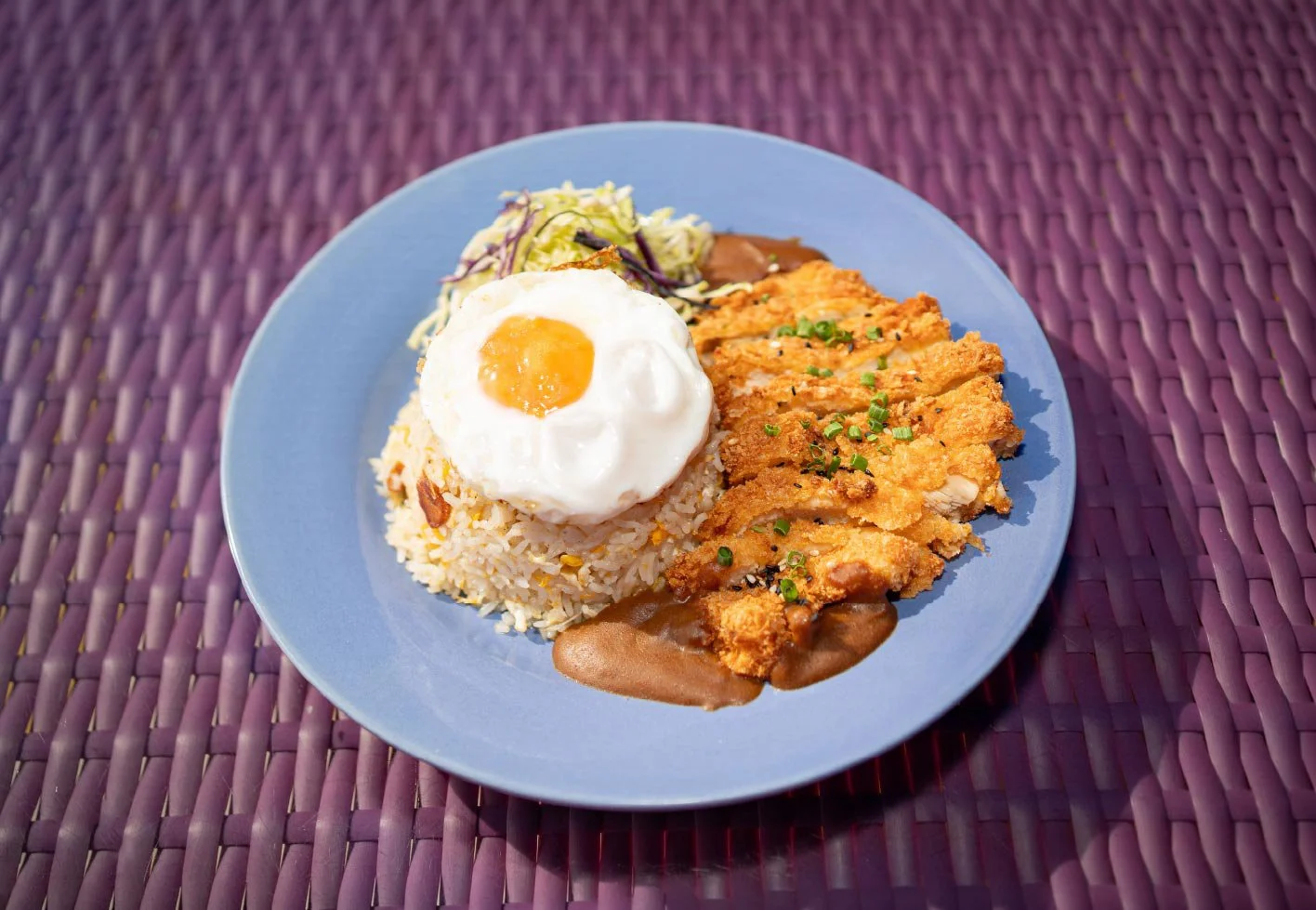 Japanese-style crispy pork loin with classic Japanese curry, served with garlic fried rice and fried egg. Also available with chicken.