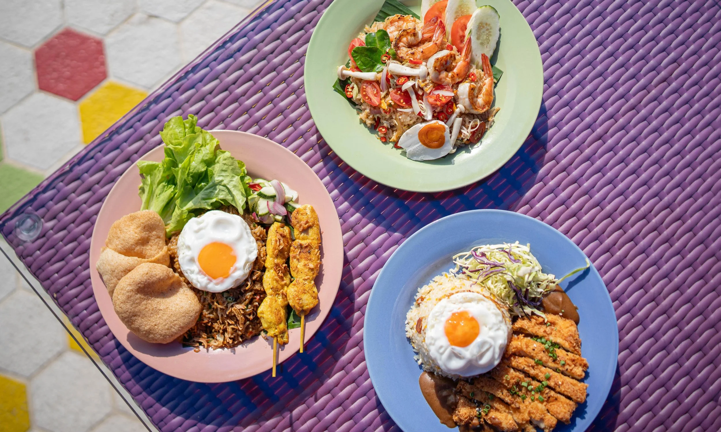 Traditional Indonesian fried rice with shrimp paste, chicken skewers, shrimp cracker and homemade pickles.